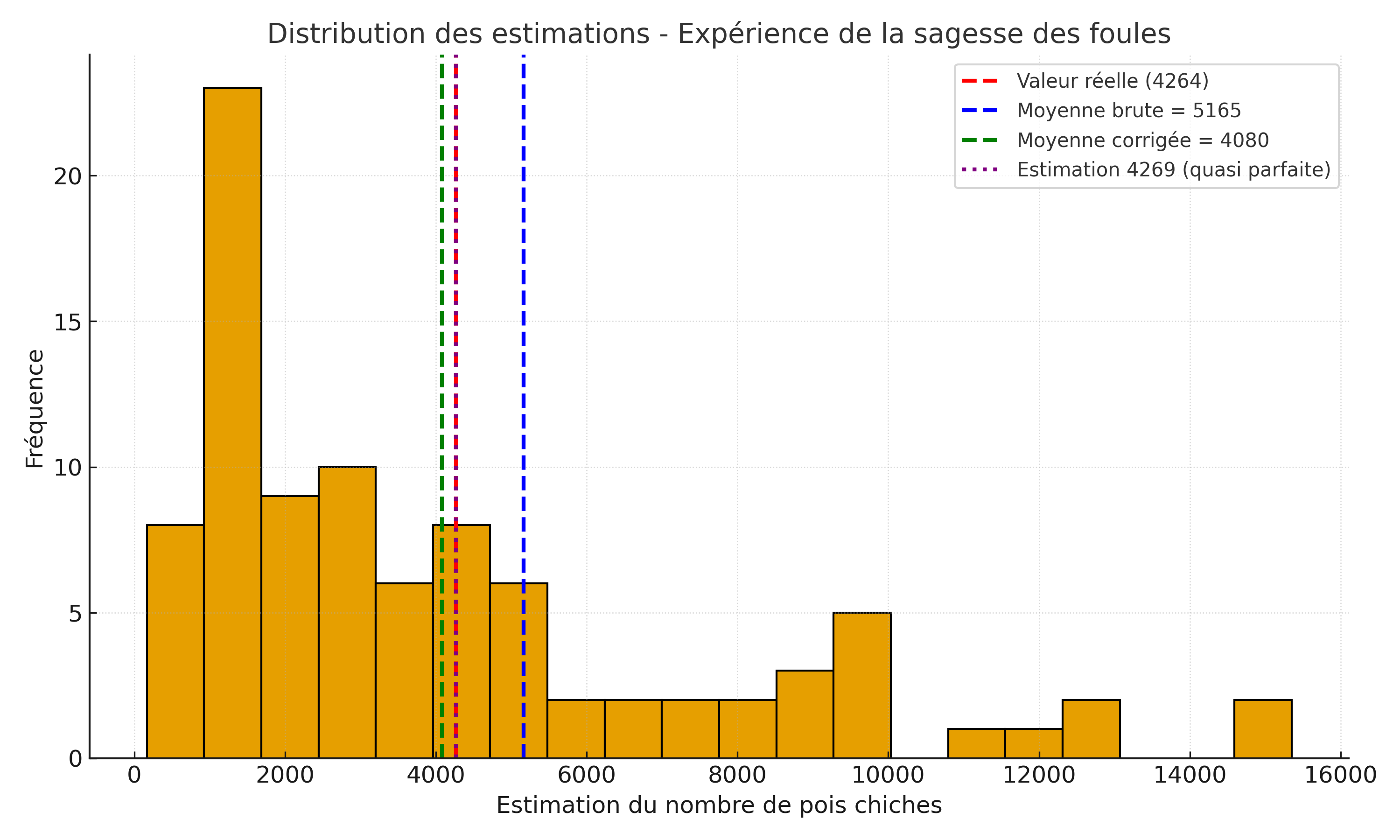 Cette expĂ©rience illustre brillamment le phĂ©nomĂšne de la sagesse des foules : lorsque de nombreuses personnes formulent indĂ©pendamment une estimation, la moyenne de leurs rĂ©ponses tend souvent Ă se rapprocher Ă©tonnamment de la rĂ©alitĂ©. Ce principe repose sur la diversitĂ© des points de vue, lâindĂ©pendance des jugements et la combinaison des connaissances de chacun.