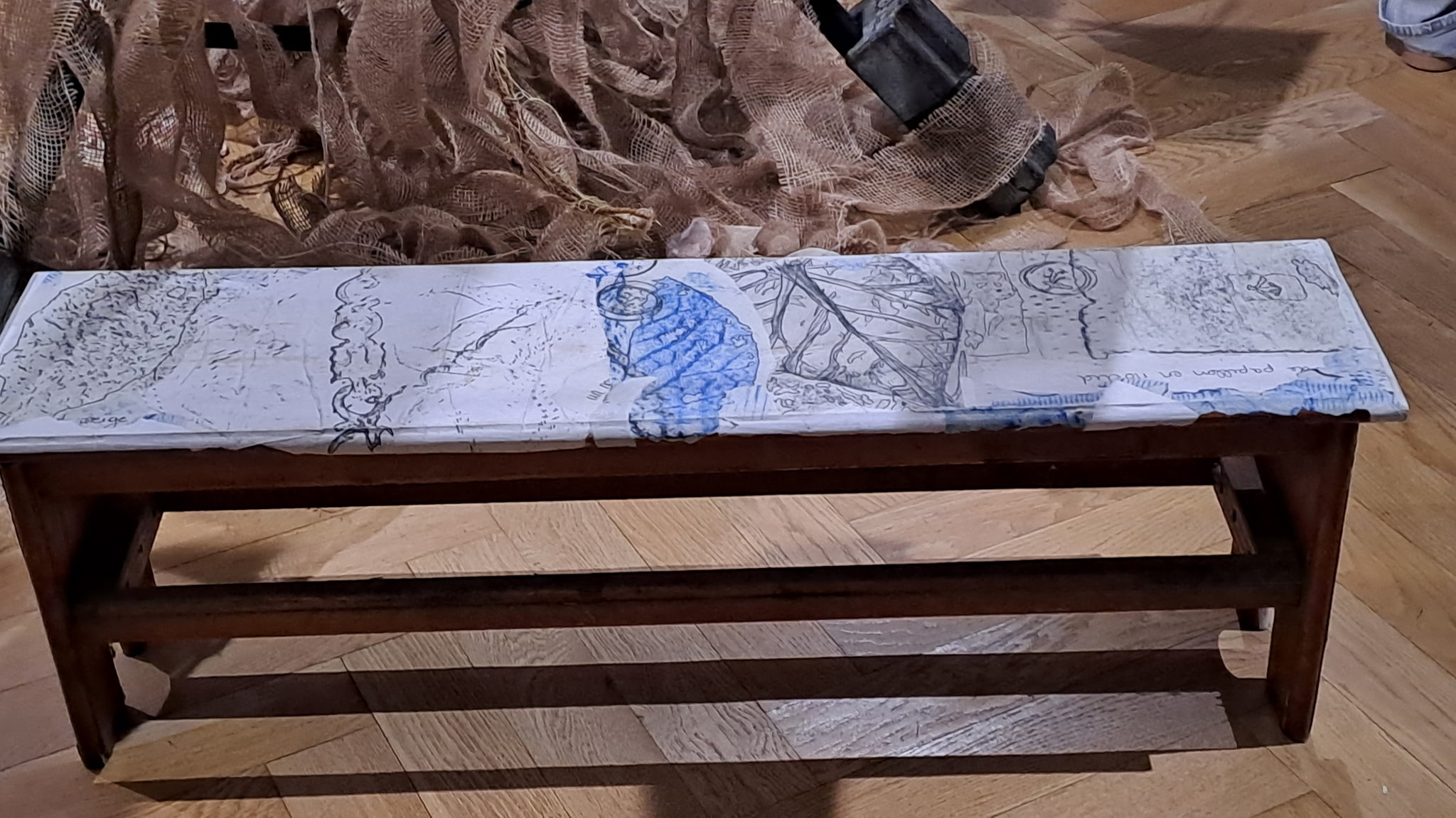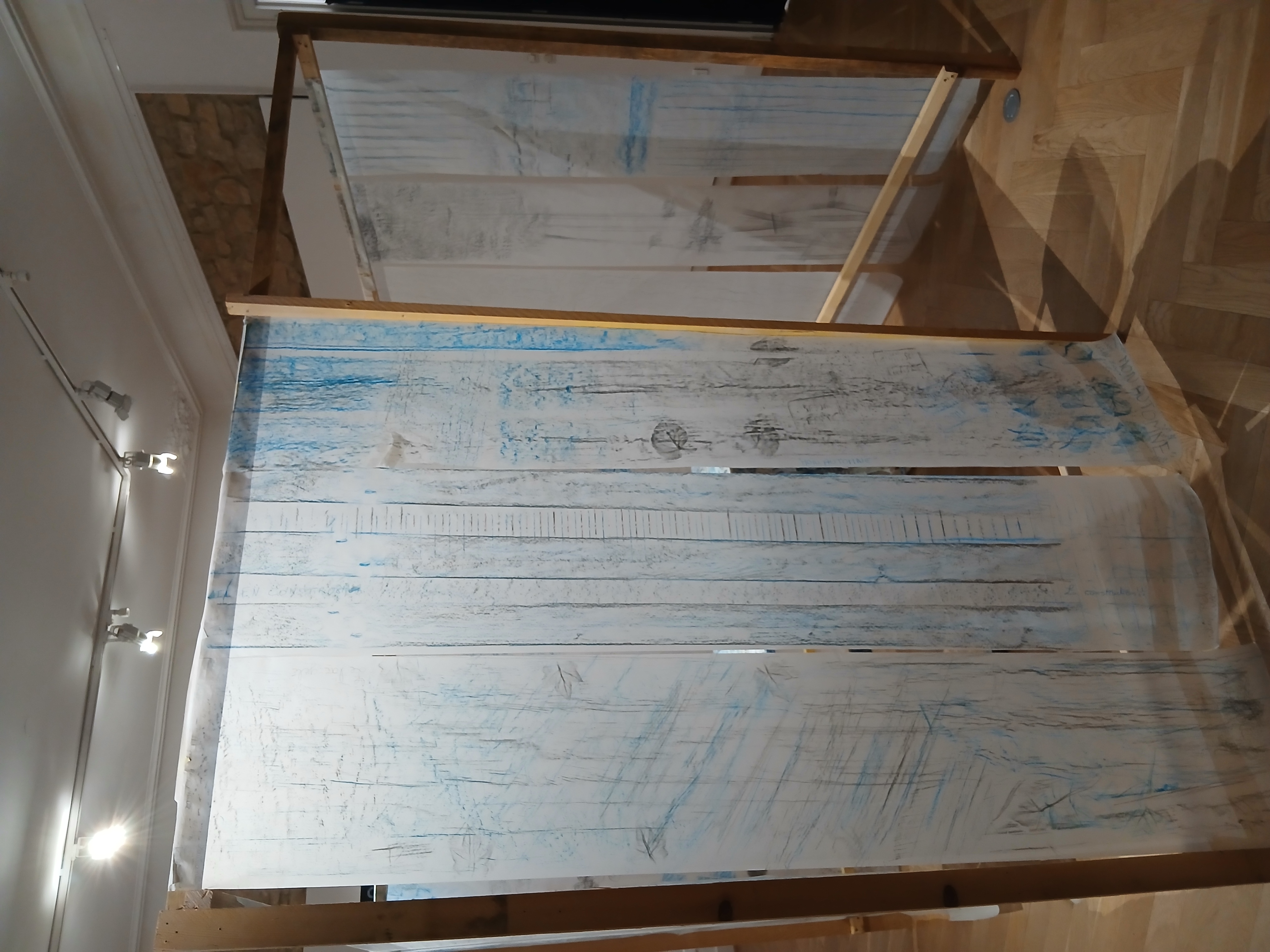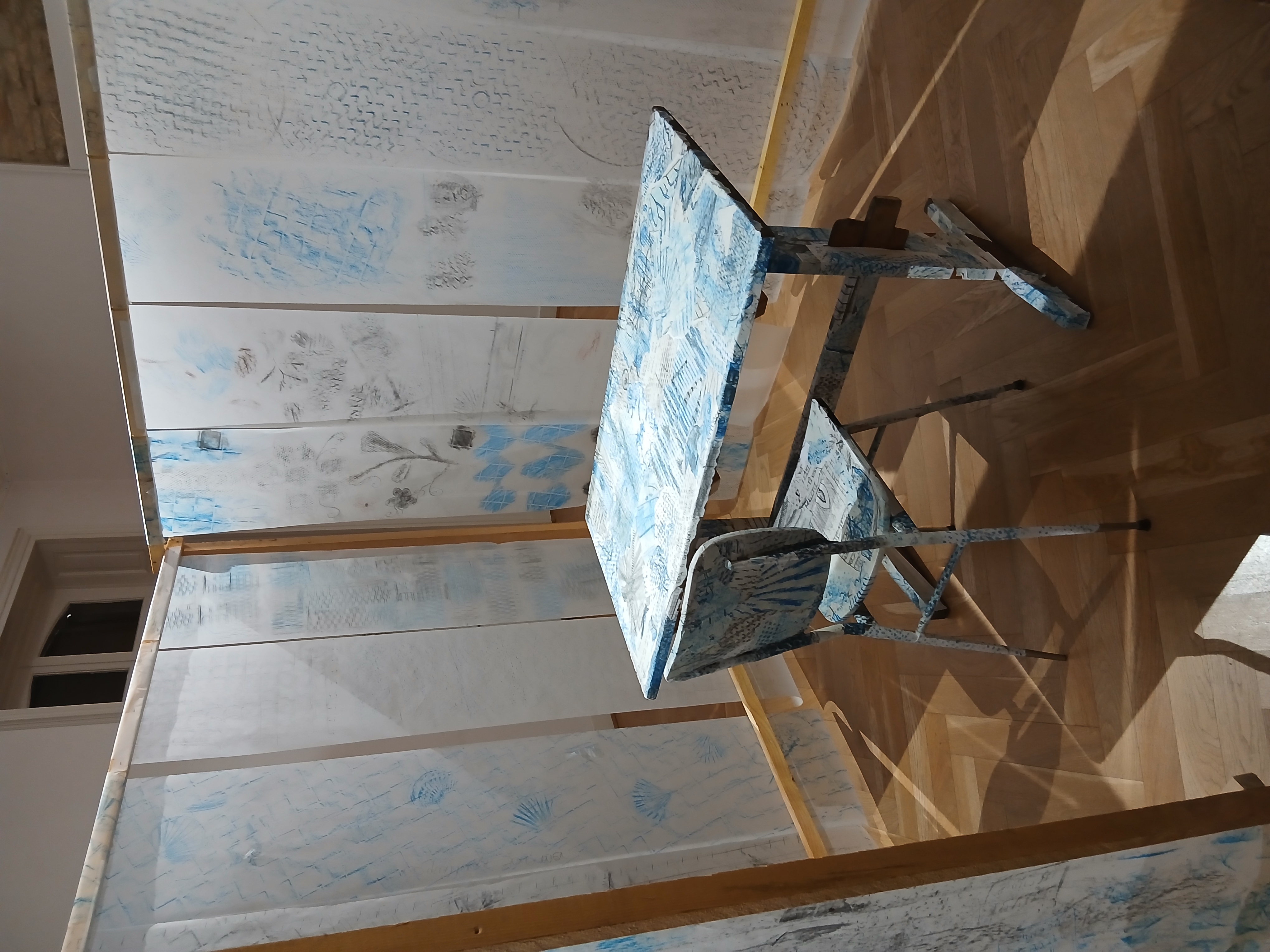 La troisième séance a été consacrée à la réécriture de manière détournée d'éléments de la signalétique du lycée toujours à partir d'empreintes réalisées sur différents papiers, découpées puis collées. Il s’agissait de revisiter les lieux du lycée, mêlant imagination et réappropriation. Lors de la quatrième séance, les élèves se sont librement exprimés sur ce projet. Leurs paroles ont été collectées et ont servi à la création d’un fond sonore qui accompagne leurs productions. Une dernière séance a été consacrée au montage de l'expo dans les salons de la maison De Launay : accrochage, découpage et collage sur différents supports.
