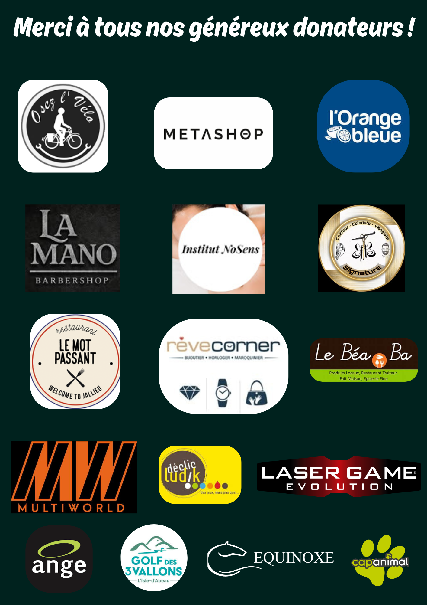 Merci à nos généreux donateurs, dont vous trouverez les noms sur l'affiche mise en pj.