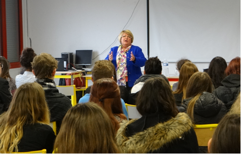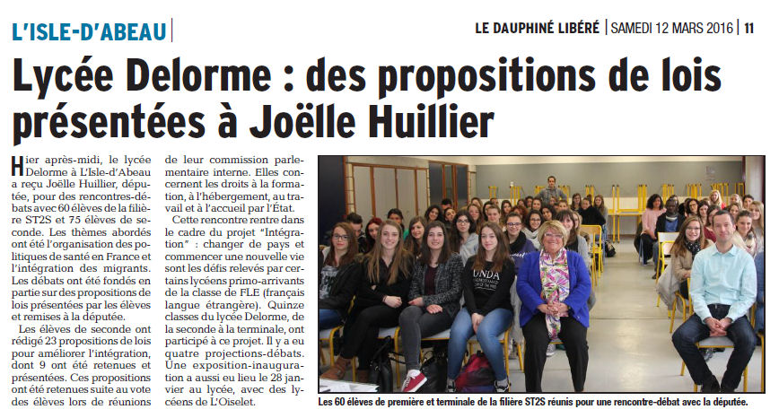 Ce vendredi 11 mars 2016, le lycée Philibert Delorme recevait dans ses mursMme Joëlle Huillier députée de la 10ème circonscription de l’Isère. Avec dynamisme, naturel et compétence, elle a échangé avec les élèves durant 2 heures. Une pierre angulaire du projet « intégration » porté depuis 2015 auprès de 15 classes par l’équipe du lycée éco-responsable.