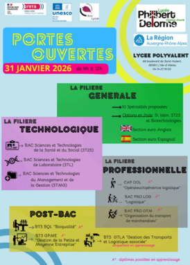 Par admin philibert-delorme, publié le mardi 17 décembre 2024 07:18 - Mis à jour le mardi 9 décembre 2025 10:50Le lycée Polyvalent Philibert Delorme vous ouvrira ses portes le samedi 31 janvier 2026 de 9h à 12h. Venez découvrir nos différentes filières de formation en initiale ou en apprentissage, et les différents bâtiments , son internat d'excellence ! -
